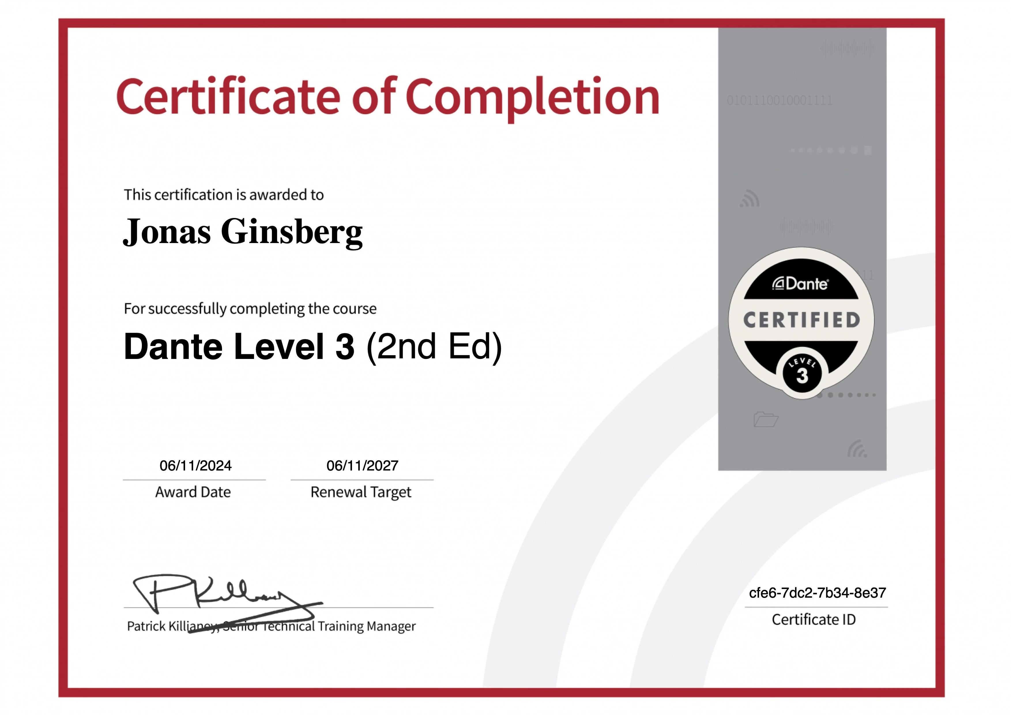 - 2024 audinate DANTE Zertifizierungsprogramm Level 3 erhalten (-> Zertifikat)